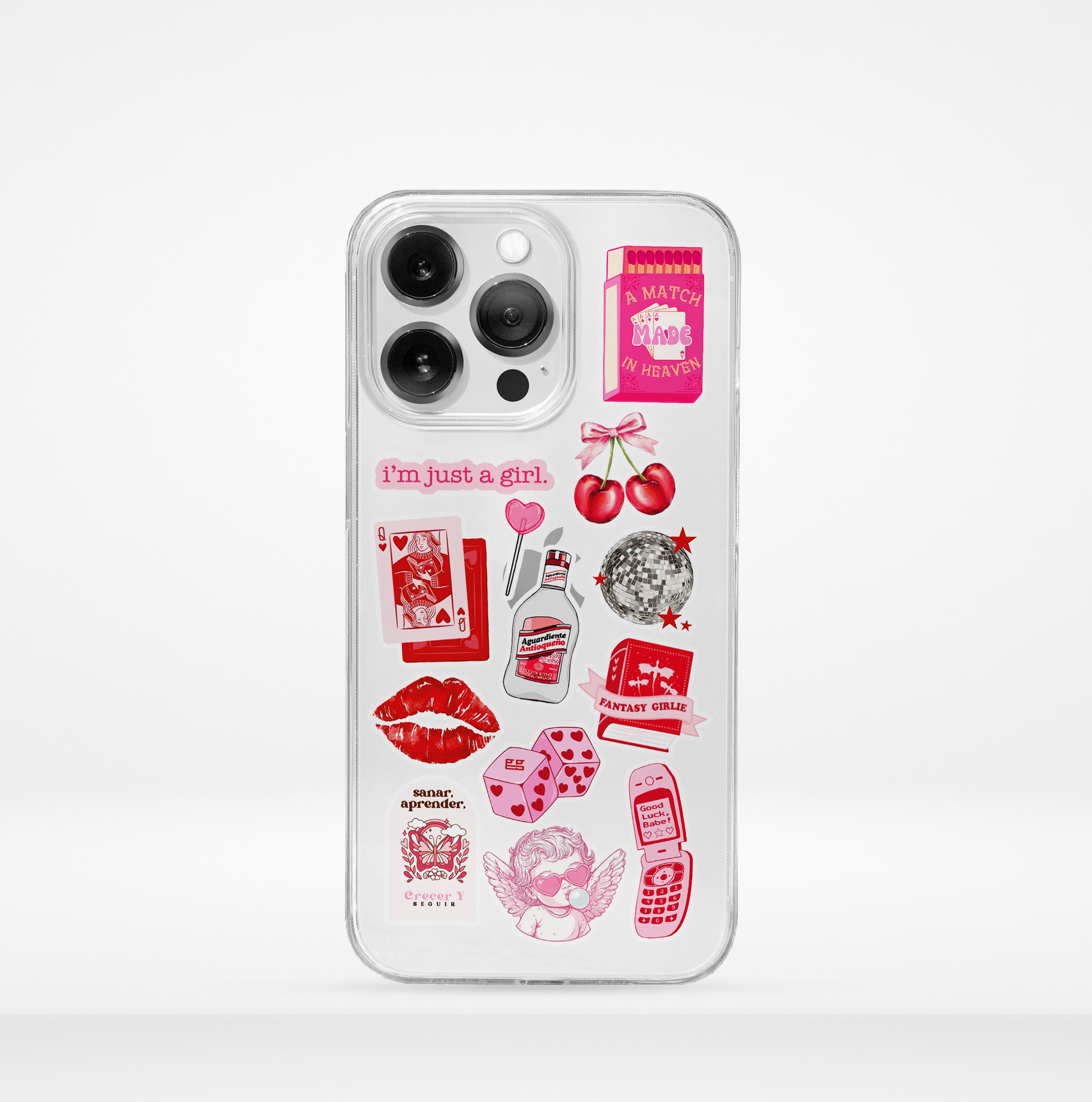 Este diseño mezcla el estilo retro-girly con stickers llenos de personalidad: cerezas, cartas, dados, besos y detalles en rojo y rosa que crean una vibra divertida, coqueta y muy trendy. Perfecta para quienes aman los diseños únicos y con mucha actitud.